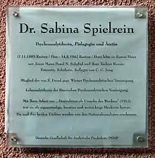 Sabina Nikolayevna Spielrein[1] (Russian: Сабина Николаевна Шпильрейн, IPA: [sɐˈbʲinə nʲɪkɐˈlajɪvnə ʂpʲɪlʲˈrɛjn]; 7 November 25 October 1885 OS – 11 August 1942) was a Russian physician and one of the first female psychoanalysts. She was in succession the patient, then student, then colleague of Carl Gustav Jung, with whom she had an intimate relationship during 1908–1910, as is documented in their correspondence from the time and her diaries.[2][3][4] She also met, corresponded, and had a collegial relationship with Sigmund Freud. She worked with and psychoanalysed Swiss developmental psychologist Jean Piaget.[5] She worked as a psychiatrist, psychoanalyst, teacher and paediatrician in Switzerland and Russia.[6] In a thirty-year professional career, she published over 35 papers in three languages (German, French and Russian), covering psychoanalysis, developmental psychology, psycholinguistics and educational psychology.[7][8] Among her works in the field of psychoanalysis is the essay titled "Destruction as the Cause of Coming Into Being", written in German in 1912.[9][10]