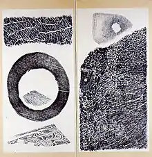 Around 1951, Hasegawa stopped working in oil painting and instead devoted himself to creating prints and ink paintings, and to exploring photography through photograms. Some of his ink paintings from this time closely approached avant-garde calligraphy practiced by calligraphers such as the members of the group Bokujinkai in the 1950s. Avant-garde calligraphy focused on the form of ink lines but often resulted in abstract art rather than conveying any legible characters.[21] Hasegawa's paintings from this time thus merged the gesturalism of Japanese calligraphy with the spontaneity of postwar Western gestural abstraction.[22] Hasegawa also created paintings in ink wash. His prints were monotypes in watercolor, gouache, or ink, made with kamaboko-ita (rectangular pieces of wood used to steam kamaboko, or fish cakes, in Japan) and funaita (ship planks) as the printing blocks. He also created ink rubbings, and mixed media pieces that combined any of the above techniques.[23]