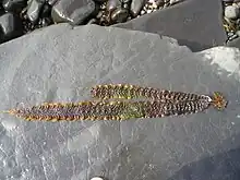 Saccharina latissima is a yellowish brown colour with a long narrow, undivided blade that can grow to 5 metres (16 ft) long and 20 centimetres (7.9 in) wide. The central band is dimpled while the margins are smoother with a wavy edge, this is to cause greater water movement around the blades to aid in gas exchange. The frond is attached to the rock by stout rhizoids about 5 mm in diameter[3] in the intertidal and sublittoral zones by a claw-like holdfast and a short, pliable, cylindrical stipe.[7]