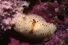 The saddled nudibranch is a pale-bodied dorid with a brownish saddle-shaped band across the middle of its back and scattered black spots over the notum. The saddle may be continuous or fade in the middle. This animal may reach a total length of 30 mm.[2]