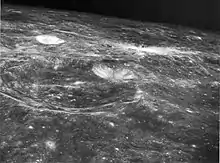 Oblique view of some of Saenger's satellite craters, including P (left of center), Q (center), and R (upper left), with part of Saenger at right. (Apollo 10)