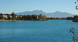Sahuarita Lake is an artificial lake that was completed on June 22, 2001, by Rancho Sahuarita. The lake surface area is 435,600 square feet (40,470 m2), with a 1-mile (1.6 km) long perimeter and maximum depth of 10 feet (3.0 m), holding approximately 70 acre-feet (86,000 m3) of water.[26] This reflects a water amount equivalent to less than one tenth of one percent (<0.1%) of the 76,000 acre-feet (94,000,000 m3) of water used by all of Sahuarita and Green Valley in 2006.[24]