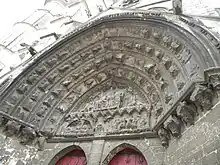 Well understood from 1950s excavations, the Romanesque choir was demolished sometime between 1500 and 1525 to make room for a new one in Flamboyant Gothic, rapidly given stained glass windows which survived the French Revolution and are the most notable feature of the church. The church was made a monument historique on 25 April 1846[1] and a restoration began soon afterwards, but this and subsequent attempts were rarely completed, with the building's overall state getting worse and worse until a general restoration of the nave early in the 20th century. The choir was already a near-ruin by the time of its bombing on 8 and 9 June 1940 and was finally fully restored after 1945.