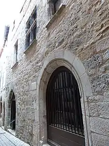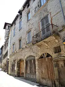 - The Caserne des Anglais (English Barracks) house, rue Guilhem-Peyré, was a base for English troops from 1352 to 1354, and eventually became a royal barracks. In 1685, dragoons were based here. After the Revolution, it was converted into a town house. The building has two stone levels topped by a third of half-timbered brick. The street facade is pierced by two entrances; the pointed arch on the left dates from the 13th or 14th century, and the simple moulded arch to the right features a 17th-century wooden door. Three mullioned windows illuminate the first floor (end 15th - early 16th century). Wooden galleries crown the top floor.[6]
