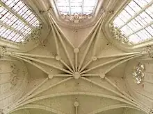 The cross and apse rib vaults are crossed by liernes and tiercerons; those in the choir aisle feature only half-ridges interrupted by medallions, suggesting the evolution of the decorative style; finally, those in the chapels are covered with semi-circular barrel vaults, several of which are decorated with bas-reliefs, and those in the side aisles with simple barrel vaults.[12] All keystones are decorated with the Batarnay coat of arms.[38]