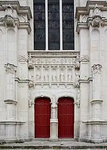 The Batarnay tomb,[44] located in the middle of the choir, was demolished in 1793, but numerous fragments were recovered and hidden in the vault above the monument. The entrance to this vault was fortuitously uncovered during work carried out during the Second Restoration, and the fragments of the tomb piled up in the chapels and transept.[45] A commission of members of the Société archéologique de Touraine visited the site in 1853 to assess the feasibility of restoring the tomb. Provisionally, the recumbent figures were replaced on a horizontal plank resting on a perpend stone, and the preserved statues were returned to their original position; however, this provisional restoration was opposed by the Historical Monuments Commission, and the whole structure was dismantled while the remains of the tomb were sheltered; another project, a little later, suffered the same fate.[22][45] It wasn't until 1875, at the instigation of Countess Branicka, that the tomb was restored by architect Roguet and sculptor Breuil,[45] as evidenced by an inscription on the monument.[40] However, instead of being placed in the middle of the choir as before, it was installed in the nave, to the left of the main portal, to facilitate the celebration of services. Moreover, in the absence of a description of the tomb in its original configuration, it is impossible to know whether it has been restored to its original state.[46]