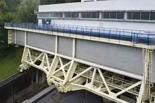 Several projects resulting from an international contest[3] had been successively studied and rejected, because some of the systems that were presented, in particular those of longitudinal type - such as the Ronquières in Belgium (1967) – were badly suited to the Vosgean site. The transverse system was the one best adapted to the topography of the site and also enabled the section of the old canal to be kept in service, limiting considerable cuts in navigation time. The only work of this type existing at the time was the Foxton inclined plane of Foxton, Leicestershire (1900).
