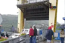 Shortly before 12pm local time, the tourist barge "Paris", which belongs to the Association and provides visits to tourists, was entering the caisson from the upper canal. The caisson suddenly moved down, jamming the barge with its 21 passengers and releasing a vast quantity of water into the valley below.[6] An extensive operation by the emergency services was put into operation with occupants of a nearby camping and a restaurant in Lutzelbourg being evacuated.[7] Through traffic on the canal was suspended while thorough inspection of the installation was undertaken, with closure originally estimated to last several months.[8] The boat lift re-opened briefly in 2014 but closed again after damage was discovered to the caisson. Ultimately the boat lift re-opened again in the summer of 2015.[9]