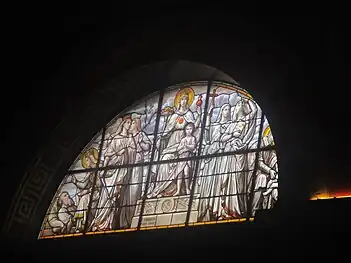 The walls on the right side of the nave are divided into sections by classical pilasters, with semi-circular stained glass windows on the upper level and alternating murals and framed paintings by prominent 19th-century French artists on the lower level.[7]