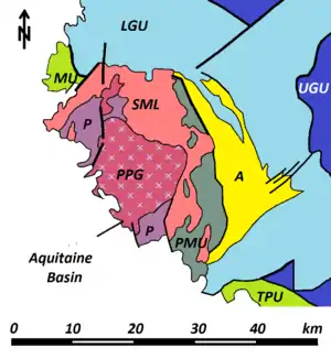 The Saint-Mathieu dome, named after the small town Saint-Mathieu in the Haute-Vienne department, is situated at the very northwestern edge of the Massif Central. To the southwest the dome structure is bordered by sediments of the Aquitaine Basin, the contact usually being marked by a border fault. On its eastern side the upwarp is overthrust by augengneisses (A) of the Lower Gneiss Unit (LGU), which between Saint-Jean-de-Côle in the South and the hamlet of Peyrassoulat (commune of Chéronnac) in the North override the Parautochthonous Micaschist Unit (PMU). The dome is bounded to the North by paragneisses of the Lower Gneiss Unit. The northwestern corner of the basement high is cut off by the Le Lindois Fault separating the dome's interior from the Mazerolles Unit in the Northwest and from Lias to the Southwest.