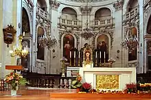 The interior design was largely inspired by the Church of the Gesù in Rome, with some French additions.The lavish decoration, decreed by the Council of Trent (1545-1563), was intended to contrast with the austere churches of the Protestants, with every element intended to elevate the meditation of the faithful. Following the doctrines of the Jesuits, the decoration also contained numerous symbols and sculptures of the Virgin Mary.[9]