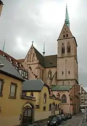 - Between 1897 and 1901, the church, which had fallen into disrepair, was fundamentally overhauled by the Karlsruhe architect Carl Schäfer, one of the most important representatives of neo-Gothic sacred architecture in Germany. At that time, the entrance was moved to the side and a new main portal was created, a copy of the northern entrance of the facade of the Strasbourg Cathedral. The cloisters were painted in polychrome, following the example of the Hortus Deliciarum.[7] The life-sized baptismal angel statue, along with the chapel and the choir glass windows,[8] also date from this time.