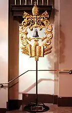 The cathedral basilica's papal tintinnabulum (basilica bell) was also blessed by Pope Benedict XVI on June 28, 2006, and was blessed a second time by the pontiff on May 23, 2007. This elaborate bell, cast in Padua, Italy, is housed within a beautiful hand-carved gold gilded wooden Italian stanchion (post) that is decorated with the papal keys and tridendum (papal crown), common symbols of the pope and his pastoral ministry. Also decorating this bell stanchion are three lilies that symbolize St. Anthony's purity, the Gospel book and flame symbolizing the eloquent preaching of St. Anthony, and four wheat stalks symbolizing the charity of St. Anthony, who fed the poor. The papal bell was once used during papal processions in Rome and today is used as a symbol of a minor basilica's definite union with the pope.