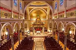 In 1972 Bishop Warren Louis Boudreaux, second Bishop of Beaumont, and Monsignor M. F. Enderle began the second major renovation of this sacred site in conformity with renewal of the Sacred Liturgy following the Second Vatican Council.[1] A free-standing altar was introduced facing the people, an appropriate bishop's chair became a permanent fixture in the sanctuary, the art in the sanctuary and throughout the cathedral was renewed, the pews were refinished, kneelers replaced, carpeting installed, and new acoustical and lighting systems added. Extensive landscaping to the grounds was introduced, the exterior was renewed, the copper dome restored and a 2,500-pipe Wicks organ installed. Bishop Bernard J. Ganter, third Bishop of Beaumont, and Monsignor Bennie Patillo undertook the building of a new cathedral center and chapel-office complex that was dedicated in 1991. In 1998, Bishop Joseph Anthony Galante, fourth Bishop of Beaumont, and Monsignor Jeremiah J. McGrath began extensive repairs of the cathedral.[1] At the beginning of the third millennium, Bishop Curtis J. Guillory, S.V.D., fifth Bishop of Beaumont, and Monsignor McGrath began a major liturgical renovation of the cathedral. On October 17, 2004, Bishop Guillory re-dedicated and consecrated historic Saint Anthony Cathedral.[1]