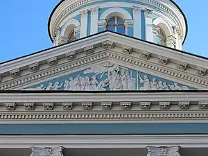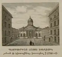 Private stables of Empress Elizabeth of Russia stood on its location in the mid-18th century,[2] until it was granted to Petersburg Armenians on May 2, 1770 by Empress Catherine the Great, upon the request of her Armenian jeweler Ivan Lazarev.[4] Its construction was primarily financed by Lazarev,[2][5] who provided 30,000 rubles of the total 33,000.[6] The church was designed by Yury Felten[4][2] and is an early example of Russian Classicism.[2] Its construction began in the spring of 1771[1] and was completed in 1776.[7] The church was consecrated on February 18, 1780 by Hovsep Arghutian (Prince Argutinsky-Dolgorukov), the archbishop of the Russian diocese of the Armenian church, in attendance of Prince Grigory Potemkin, the favourite of Catherine the Great.[4][3] It is named after Catherine of Alexandria, a namesake of the empress.[8] Colored white and blue, it has a neoclassical portico and single cupola.[9]