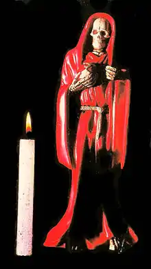 Nuestra Señora de la Santa Muerte (Spanish: [ˈnwestɾa seˈɲoɾa ðe la ˈsanta ˈmweɾte]; Spanish for Our Lady of Holy Death), often shortened to Santa Muerte, is a new religious movement, female deity, and folk saint in Mexican folk Catholicism and Neopaganism.[1][2]:296–297 A personification of death, she is associated with healing, protection, and safe delivery to the afterlife by her devotees.[3] Despite condemnation by the Catholic Church,[4] and more recently Evangelical pastors,[5] her cult has become increasingly prominent since the turn of the 21st century.[6]