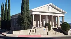 The one story building measures 45 by 95 feet (14 m × 29 m) and is constructed of local tufa limestone on a stone foundation with a gable roof. The basement is partially above ground; a wide imposing tone staircase rises from ground level to the first floor. The main entry is recessed behind a front porch supported by six Tuscan columns. The entry has sidelights on both sides and a transom above topped with a pediment. The north side has four sets of three light double-hung windows with transoms, while the south side has individual one-over-one double-hung windows. The building is significant for its architecture which complements the nearby Mohave County Courthouse,[1] which was built two years earlier and of the same material.[2] While built during the Neo-Classical Revival period, it is of the Classic Roman Temple form. It is the best example of such a building in Arizona, which were not common in the timeframe in which it was constructed. The construction date of 1917 is known from the building's cornerstone.[1]