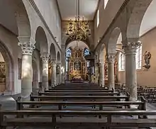 The Catholic basilica originates from around 830,[1] and the late gothic chancel was built from 1441. The church stands at the east of the old part of the town Höchst, looking over the Main river.