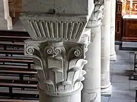 The remainder of the Carolingian work is however intact: the two other sanctuaries, the central nave with small round-arched clerestory windows, the flat ceiling, the aisles, and at the top of the two sets of five columns - Corinthian capitals, which belong to the most important works of Carolingian art.