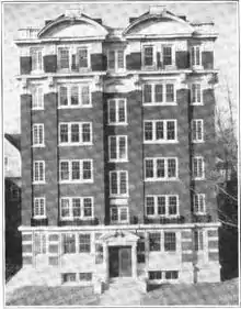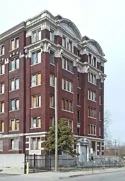 The Saint Rita Apartments is a six-story English Renaissance Revival red brick apartment building. The exterior has extensive terra cotta detail work.[2] The terra cotta ornamentation is most noticeable at the roofline.[3]