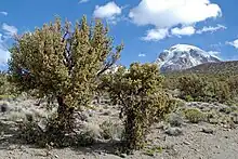 The Queñoa (sometimes seen as keñua) forests that rise along the slope of the Sajama Mountain in the park are regarded as some of the highest forests in the world.[1] There are numerous geysers and hot springs (Aguas Termales) which are about an hour walk from the village of Sajama.