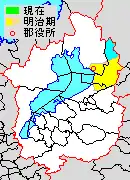 By the time of founding, the district compromise the areas of the cities of Maibara, Hikone Toriimoto area, and the city Nagahama (former city). On April 1, 1943, the city of Nagahama (former city) was formed, and in 1952, the village of Toriimoto was merged into the city of Hikone. On February 14, 2005, the towns of Ibuki, Santō, and Maihara merged to form a new city called Maibara. Sakata District has been dissolved after Ōmi merged into Maibara on October 1, 2005.