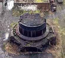 During blowing down of the furnace the salamander is tapped by drilling a hole in the blast furnace hearth.