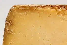 Salers (French: Le Salers) is a French semi-hard cheese originating from Salers, in the volcanic region of the Cantal mountains of the Massif Central, Auvergne, central France.[1] It is a pressed, uncooked cheese, sometimes made from Salers cow's milk (it's then called "Tradition Salers"), between 15 April and 15 November.[1] It is circular in shape, formed in rounds weighing around 40 kilograms (88 lb).[1] The cheese is aged in caves at temperatures ranging from 6–12 °C (43–54 °F) for a minimum of 3 months, and up to 45 months.[1]