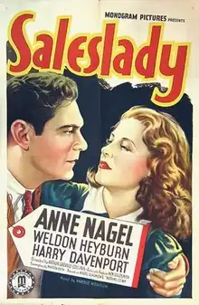 Saleslady is a 1938 American romantic comedy drama film directed by Arthur Greville Collins and starring Anne Nagel, Weldon Heyburn and Harry Davenport.[1][2] Based on the story Nothing Down by Kubec Glasmon, it was produced and distributed by Monogram Pictures.