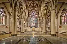 Further restoration and re-ordering were carried out in 1971–72 at a cost of £80,000. This included the erection of a new free-standing altar located under the crossing, following the Second Vatican Council. A further re-ordering of the choir (chancel) took place in 1988, including the removal of the original stone high altar and reredos, installed in 1853–55 to designs by George Goldie.