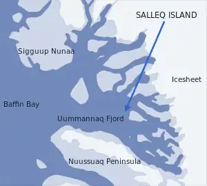 Salleq Island (old spelling: Sagdleq) is an uninhabited island in the Avannaata municipality in northwestern Greenland. It is located in the north-central part of the Uummannaq Fjord.[1] The walls of the island feature characteristic multicolor bands of gneiss and granite layers.