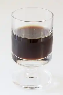 Salmiakki Koskenkorva is a somewhat viscous black liquid, or a dark grayish brown when of a thinner consistency. Upon closer inspection, very fine particles of carbon black are visibly suspended in the liquid.
