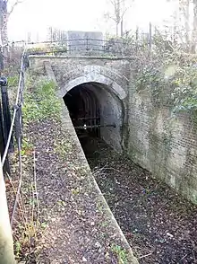 Clarendon Arch is a barrel vaulted tunnel which carries Salmons Brook below the New River at Bush Hill. Originally the brook was spanned by a bridge constructed between 1608 and 1613. In 1682 the bridge was replaced by an arch named after the then Governor of the New River Company, the Earl of Clarendon. This was commemorated by a carved ornamental keystone with an inscription. The arch was again rebuilt in 1725 and is now a statutory listed Grade II structure.