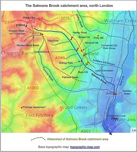 In the case of Salmons Brook immediately after the glaciation, that stream joined the River Lea somewhere around Bush Hill, where there is a deposit of "Boyn Hill Gravel".[6] That gravel, which is on the highest of the river terraces left by the post-Anglian lower River Lea, marks the line followed by the Lea after the retreat of the ice sheet.