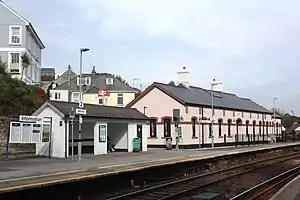 Saltash railway station (Cornish: Essa) serves the town of Saltash in Cornwall, England. It is on the south side of the town between the Royal Albert Bridge which crosses the River Tamar and the Coombe Viaduct which spans a small tributary of the same river. Trains are operated by Great Western Railway. The station is 251 miles 26 chains (404.5 km) from London Paddington via Box and Plymouth Millbay.[1] The line singles at the east end of the station passing over the Royal Albert Bridge.