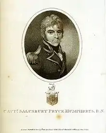 Salusbury Pryce Humphreys was born at Clungunford Rectory, Shropshire, on 24 November 1778, the third son of Reverend Evan Humphreys and his wife Mary.[1][2] He entered the navy on 1 July 1790, during the Spanish Armament, serving as a volunteer aboard the 64-gun HMS Ardent, which was then under the command of Captain James Vashon. He was next aboard the 50-gun HMS Trusty, the flagship of Rear Admiral Sir John Laforey in the Leeward Islands, followed by a posting to the 32-gun HMS Solebay, commanded by Captain Matthew Squire.[1][2] He was rated as able seaman during this last posting, after which he was moved to the 14-gun HMS Fairy, commanded by Captain Francis Laforey. His next ship was the 50-gun HMS Severn, under Captain Paul Minchin, where he was rated as midshipman some time before the outbreak of war with Revolutionary France in February 1793.[1] Severn conveyed the Governor General of Canada, Lord Dorchester, and his family and suite, to Quebec, returning to Britain in 1794.[2] Humphreys followed Minchin to his next command, the 38-gun HMS Hebe, and went out to the West Indies. While serving there, Humphreys was ordered to act as lieutenant of the 14-gun HMS Fury under Captain Henry Evans in April 1796.[1][2]