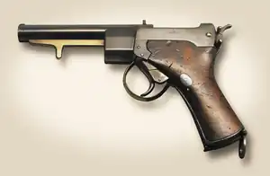 The Salvator-Dormus pistol is the earliest-patented semi-automatic pistol. It was patented on 11 July 1891, by Archduke Karl Salvator of Austria and Count Georg von Dormus. As the first of its kind, it was designed without the benefit of experience with earlier models. Various modifications were made with approximately twenty prototypes before thirty pistols of a workable design were submitted for Austrian military trials in 1896. This 8 mm delayed blowback pistol loads through the top and has a hinged magazine door on the butt. The pistol has a separate bolt release and safety. The production delay between patent and military trials allowed comparisons with other self-loading pistols, and the Salvator Dormus was considered inferior to its competition. The designers abandoned this project; and few pistols survive.[2] The Bundeswehr Museum of German Defense Technology in Koblenz has one of these specimens in its collection.