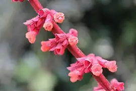 The dark green leaves, with a yellow undertone, are about 7 in (18 cm) long by 3.5 in (8.9 cm) wide, with serrated edges, and with velvety red-brown hairs on the petiole and stem of the new leaves. The leaves bear a sage scent. The inflorescences are covered with velvety red-brown hairs, with the stems and the calyx also having a red-brown color. The 0.5 in (1.3 cm) flowers are orange-red, and very profuse, explaining the epithet confertiflora, or "crowded with flowers". The plant grows so large that it needs staking and protection from wind in gardens.[2]