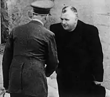 Another result of the Salzburg talks was the appointment of various German advisers to Slovakia, although these advisers were not completely new, nor were they unique to Slovakia.[29] The previous German envoy Hans Bernard was replaced[30] by Manfred von Killinger, a Sturmabteilung officer who described his purpose as making Slovakia "economically 100 per cent at [our] disposal".[31] Killinger was accompanied by a staff of German economic experts.[30] The other advisers appointed in the months following Salzburg were:[32]