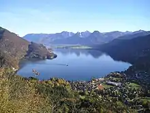 View of the Lake Altaussee and Altaussee, in the background the Hoher Dachstein