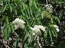 Trees up to 8 m, irregular trunk.[4][5] Leaves compound, with 7-9 ovate-oblong leaflets, margin serrate, acute apex, hairy underside.[4][5] The inflorescences are cymes 18–22 cm long, with white fragrant flowers.[4][5] The fruits are black berries 1.2 cm in diameter, with 3-5 seeds.[4][5]