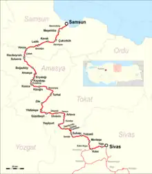 The Samsun–Kalın railway is a 377.7 km (234.7 mi) long railway in the Black Sea Region of Turkey. It connects to the Ankara–Kars railway, near Sivas from the port city of Samsun, running through the Pontic mountains. It is one of two railways that service a Black Sea port, along with the Irmak–Zonguldak railway.
