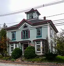 The Philbrook House is a two-story wood-frame structure, three bays wide, with a hip roof and a granite foundation. The roughly square main block has a 1+12-story ell extending from its rear, joining it to a large barn/carriage house, all of which are of similar vintage construction. The house is proportioned in typical Italianate fashion, with its somewhat block shape elaborated with significant decorative woodwork. The main (east-facing) facade has a center entry sheltered by an elaborate hood, and is flanked by projecting polygonal bays with wood panel sections below the windows, and a bracketed cornice above. The main roof line is modillioned, and there is a gable centered above the entrance, in which there is a half-round window with keystone. The roof is topped by a square cupola with paired round-arch windows on each side, and a bracketed cornice below a flared pyramidal roof.[2]