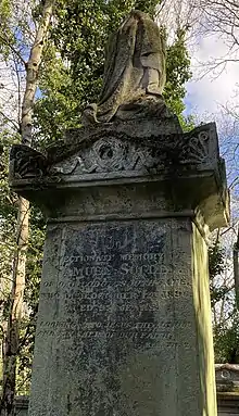 Sugden died on 12 October 1896, aged 97, leaving his estate to trustees. By that time he was known as Samuel Sugden the elder. Probate was granted in London to "Samuel Sugden gentleman, Charles Alfred Sugden merchant and Charles Eustace-Wilson gentleman" on an estate of £140,034, resworn in 1898 in the amount of £139,005.[15] Charles Alfred Sugden was Samuel's son from his second marriage, Charles Eustace-Wilson was a solicitor, and the living Samuel Sugden was his son from his first marriage. In July 1897, Oak Lodge was advertised for sale by auction in The Times.[16] He is buried on the west side of Highgate Cemetery.