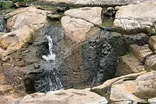 The most outstanding lithic work is called "Fuente de Lavapatas", in the rocky bed of the ravine of the same name, where there is an elaborate ceremonial fountain with three pools and numerous serpentine and batracomorphic figures in low relief, surrounded by tiny channels through which water flows. It has been suggested that the site was dedicated to the worship of aquatic deities and to the practice of healing ceremonies.