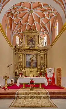 The church retains its 14th-century Mudéjar layout with Gothic tracery creating elaborate star-shaped geometric lines. The aisles have four chapels: two of Mudéjar design, including the baptistry. The other two were built in the 18th century with gothic tracery ceilings.