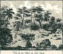 The settlement started after the discovery around 1632[5] of the healing power of a hot water spring nearby the Caiguanabo river (sp. Río Ariguanabo), by Taita Domingo, a slave on the San Pedro de las Galeras ranch who had become affected by some skin disease. This came to be known in the surroundings and people suffering from illnesses started to visit the place.[6] In 1793 a hermitage opened under the name of San Diego[7][8] and the place became known as "Baños de San Diego".[6] Some say that Alexander von Humboldt visited the place[5] in 1801;[9] this seems very unlikely. He did pass at San Antonio de los Baños on his way from Havana to Batabanó anchorage,[10] where he stayed from 6 to 8 March 1801;[11] before boarding a boat en route to Trinidad.[10] But the area he covered all in all in Cuba is, in his own terms, "the 100 square leagues between Havana, Matanzas and Batabano, next to Trinidad"[12] (p. 350), and there is no mention of him visiting any place east of Havana.