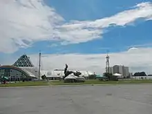 San Dionisio's transportation network consists of two national primary roads, one national secondary road and one expressway as of 2017.[13] The Manila–Cavite Expressway and Elpidio Quirino Avenue provide north–south connectivity, with the latter traversing the barangay's old section and the Kabihasnan commercial row along Victor Medina Street. The barangay's main east–west corridor is Dr. Santos Avenue which links its old section with the bigger commercial developments in its eastern sector, including the SM City Sucat shopping mall. In a bend of the avenue north of Victor Medina Streets starts Ninoy Aquino Avenue, a national secondary road that links the barangay to Ninoy Aquino International Airport as well as the popular Dampa, a collection of stalls and restaurants near the boundary with La Huerta that sell and cook fresh and locally-caught seafood.[14] A recent addition to the barangay's road network is the south extension of C-5 Road which opened a large tract of former idle lands south of the international airport in San Dionisio to vertical commercial and residential developments in 2007.