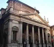 The imposing Neoclassic pronaos (1823) of the facade, designed by Giuseppe Maria Talucchi has four monumental columns, flanking advanced wings with pilasters, and triangular tympanum. The sober linearity clashes with the decorative interior with its playful, shell-shaped Juvarrian window frames. The six chapels have elliptical domes. Juvarra designed the polychrome marble pavement of the presbytery. Along the nave are medallion bas-reliefs by Giovanni Battista Bernero.