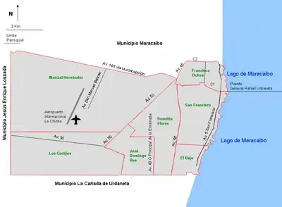 In his 1830 atlas of Venezuela, Agustín Codazzi recorded a Punta de San Francisco located between the towns of Maracaibo and La Cañada. San Francisco was first officially recorded as the name of a parroquia in 1881.[4] The current municipality was created on 22 January 1995 from the parroquias of San Francisco, Francisco Ochoa, Marcial Hernandez, and Domitila Flores, all previously part of the municipality of Maracaibo.[5]